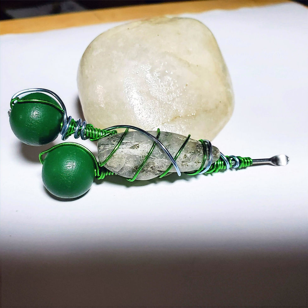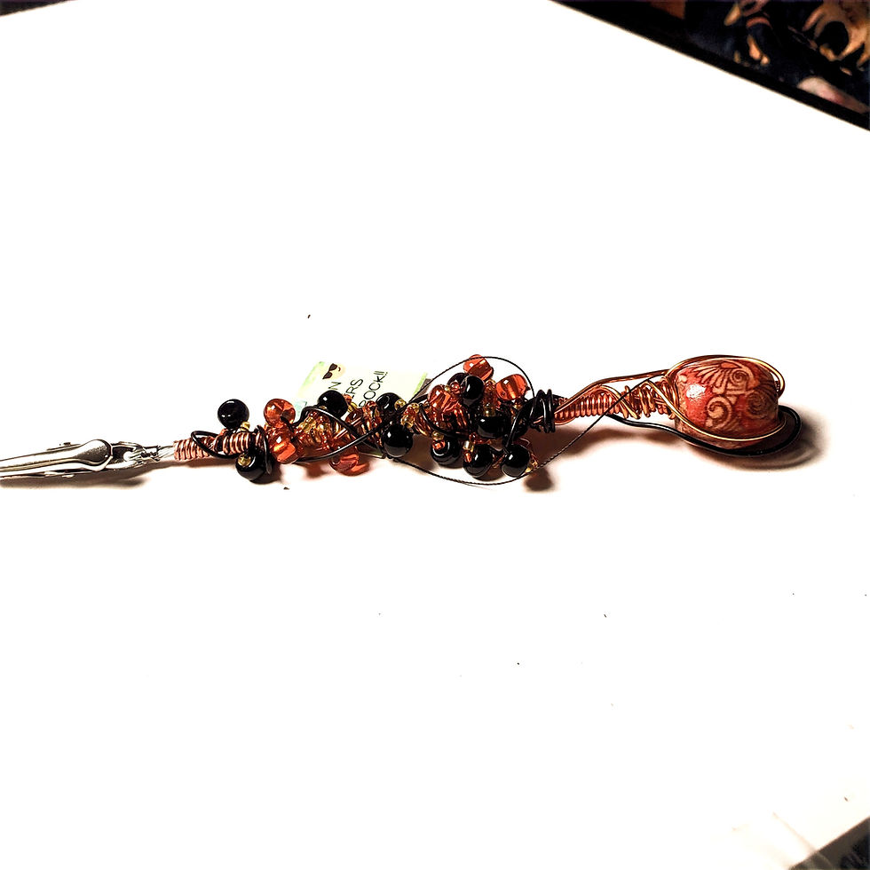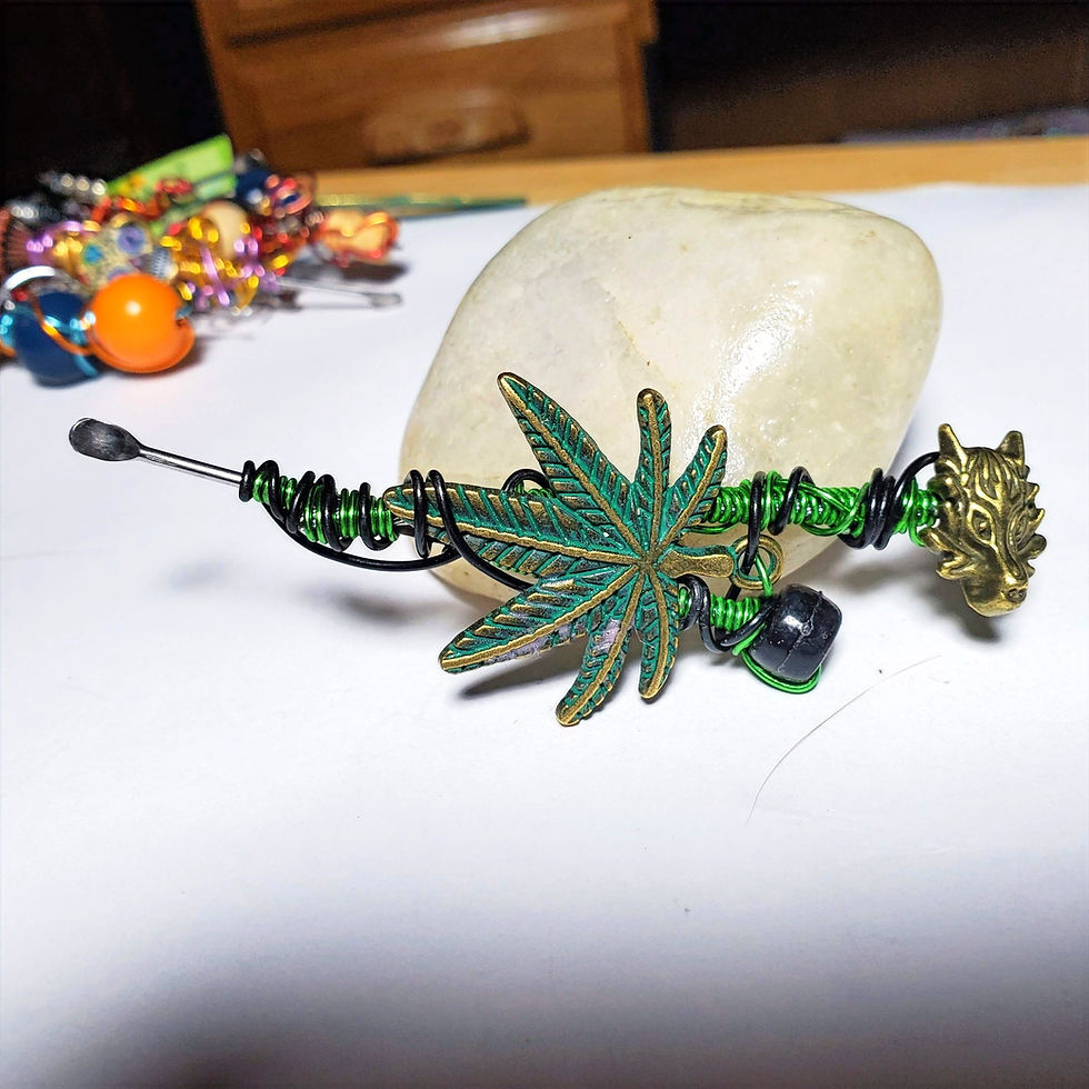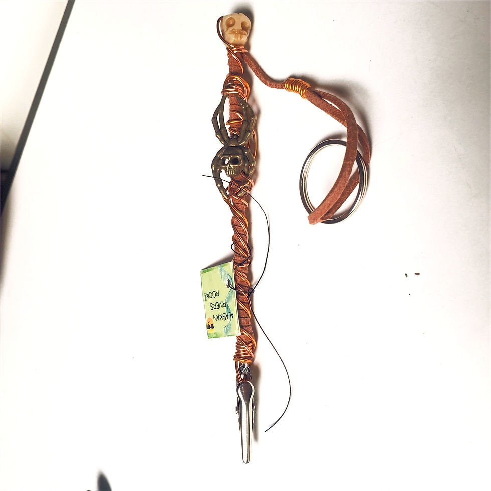 * CRUSHED RIVER STONE, LEATHER, WIRE, GOLDEN TRINKETS