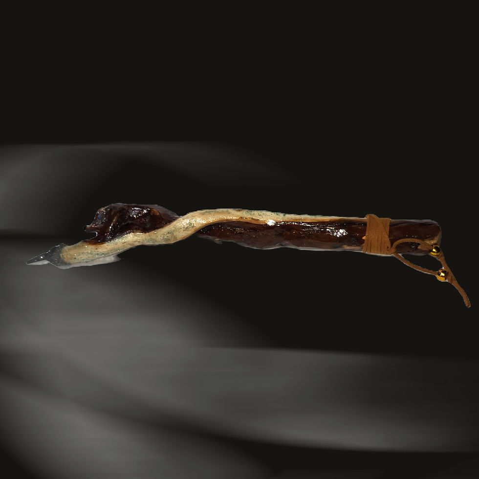 * CRUSHED RIVER STONE, LEATHER, WIRE, GOLDEN TRINKETS